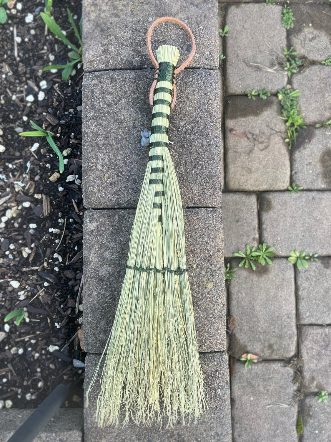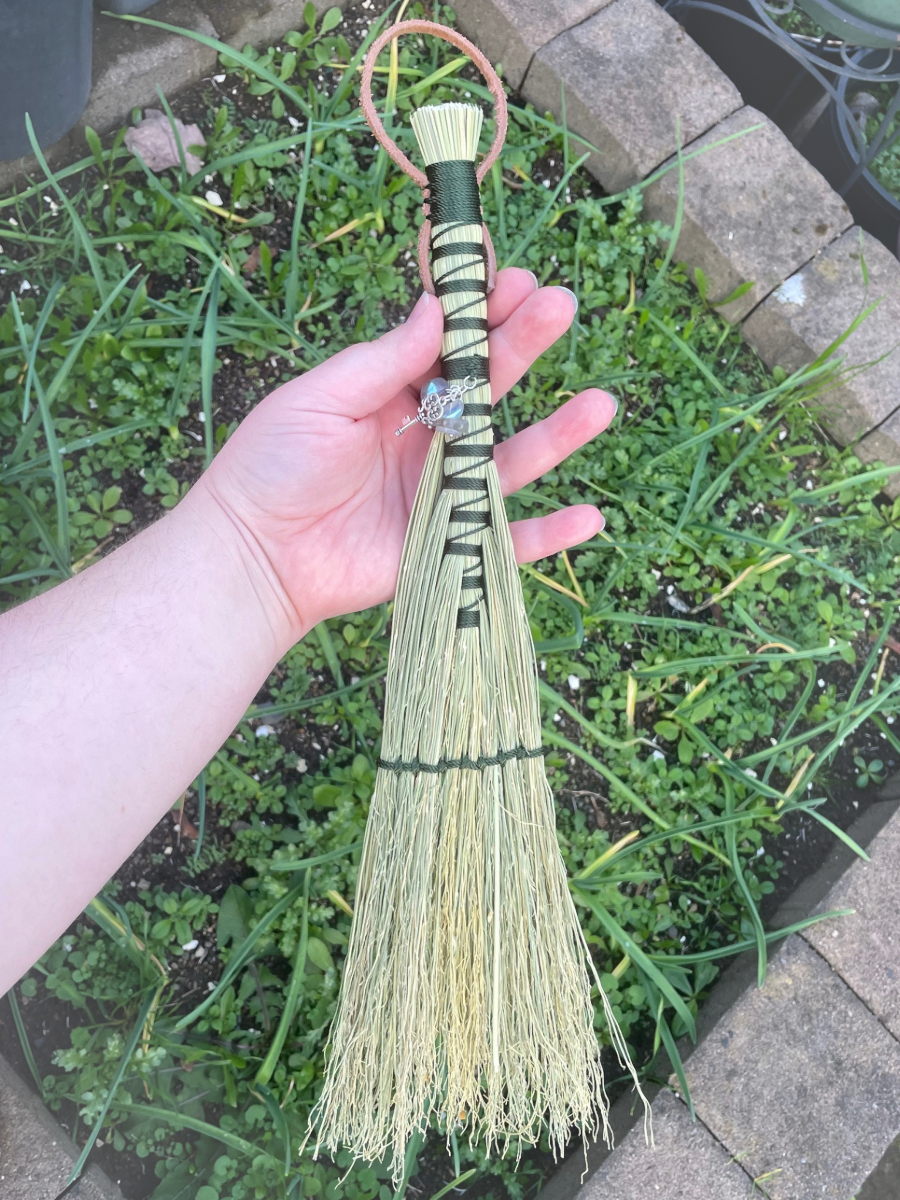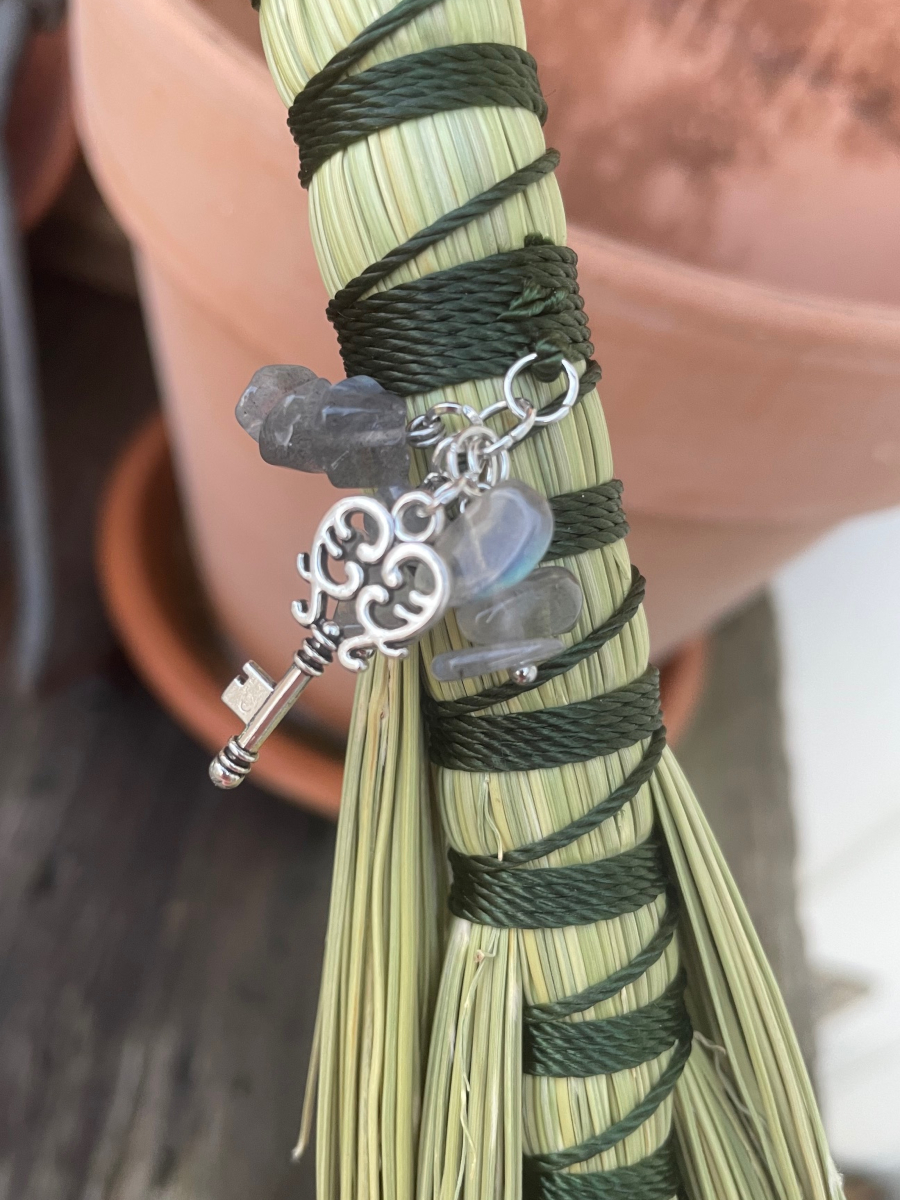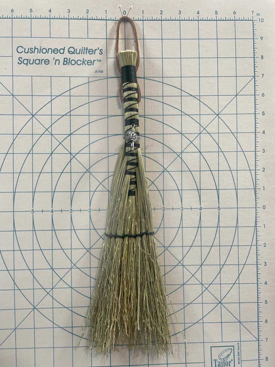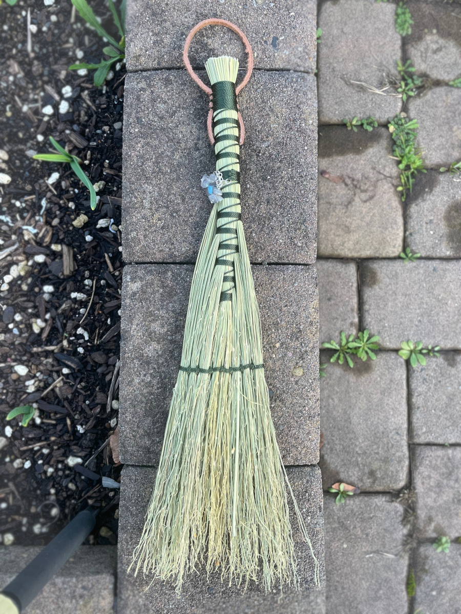 Handmade Hawk Tail style hand broom, approximately 15″ from top of handle to bottom of sweeping edge. Forest Green cord handle with natural broomcorn body. Has Labradorite and key charm.