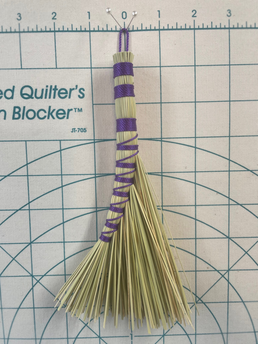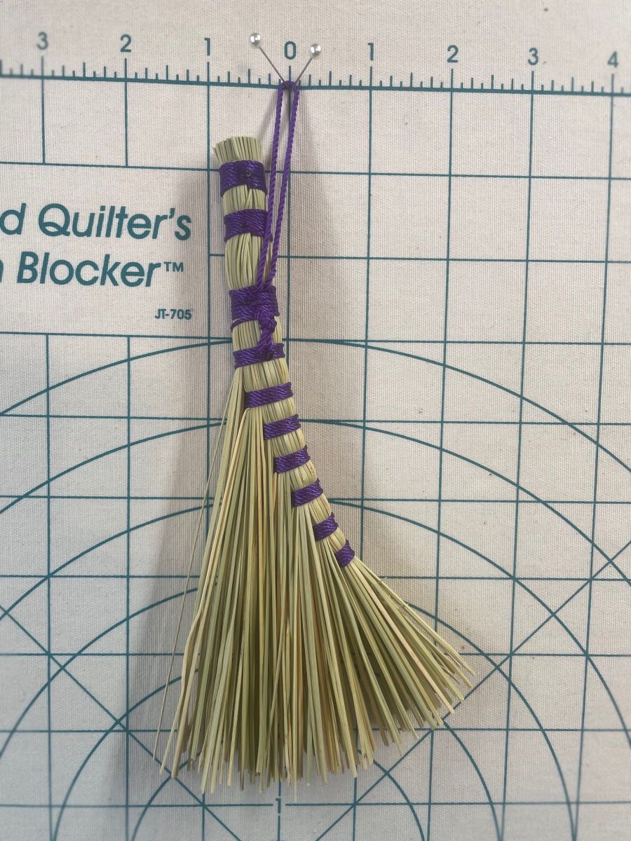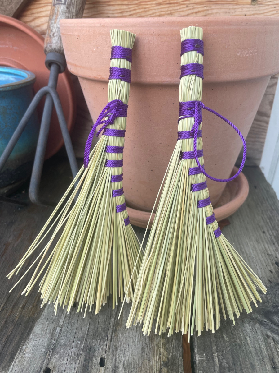 Handmade Small Turkey Wing Style Broom, approximately 8” from top of handle to sweeping edge. I crafted these with natural broomcorn and Purple nylon cord. Simple, cute, and beautiful!