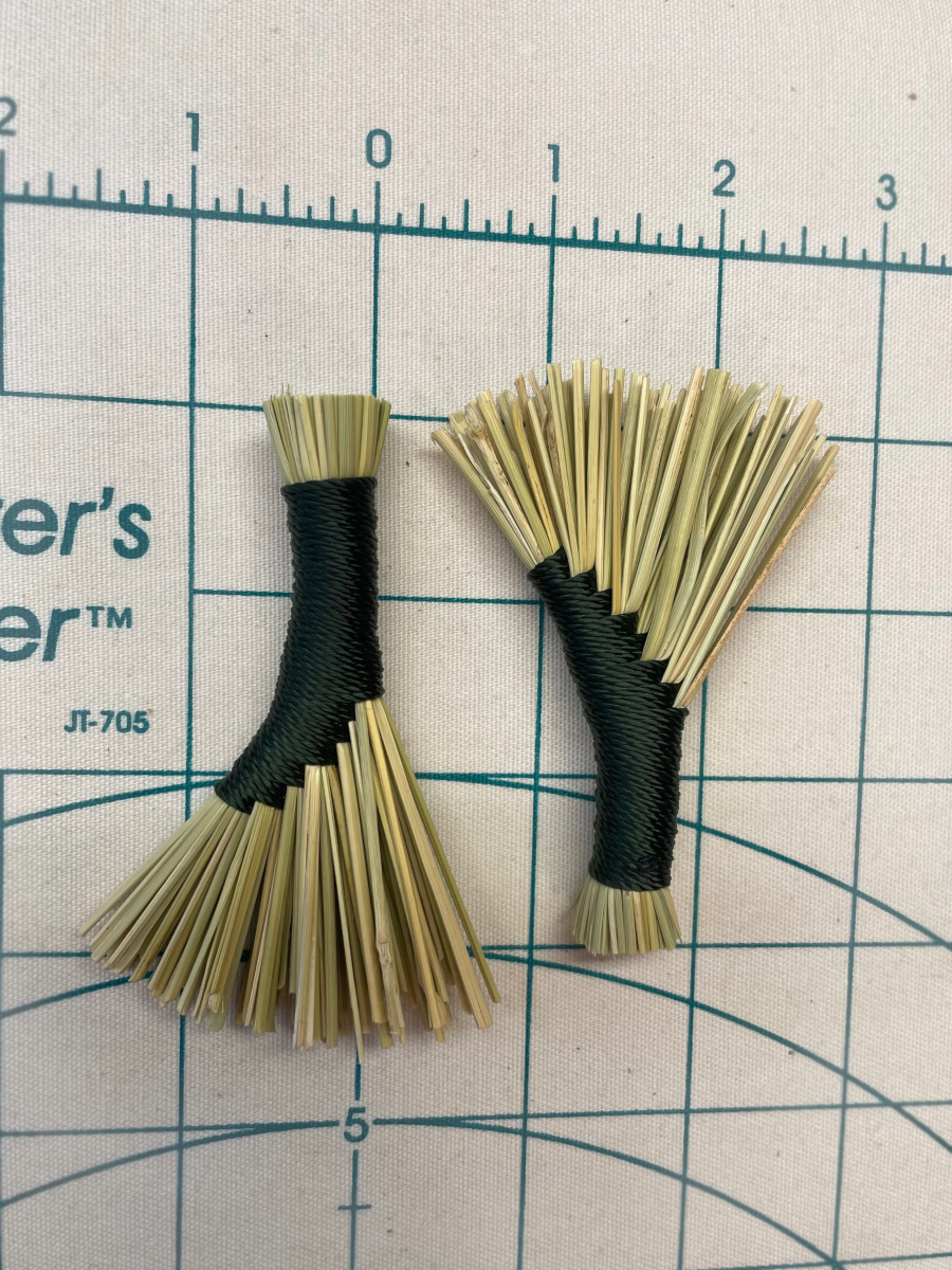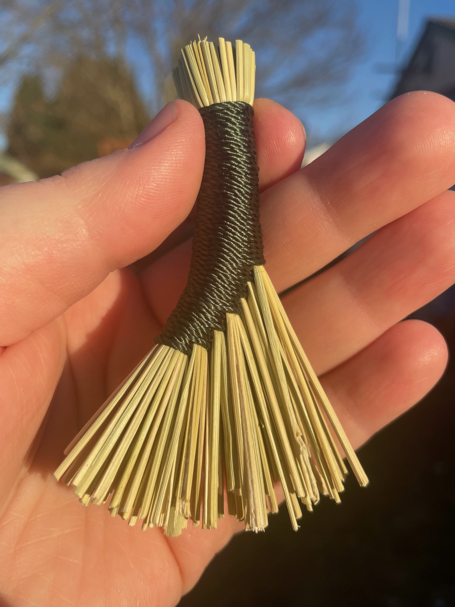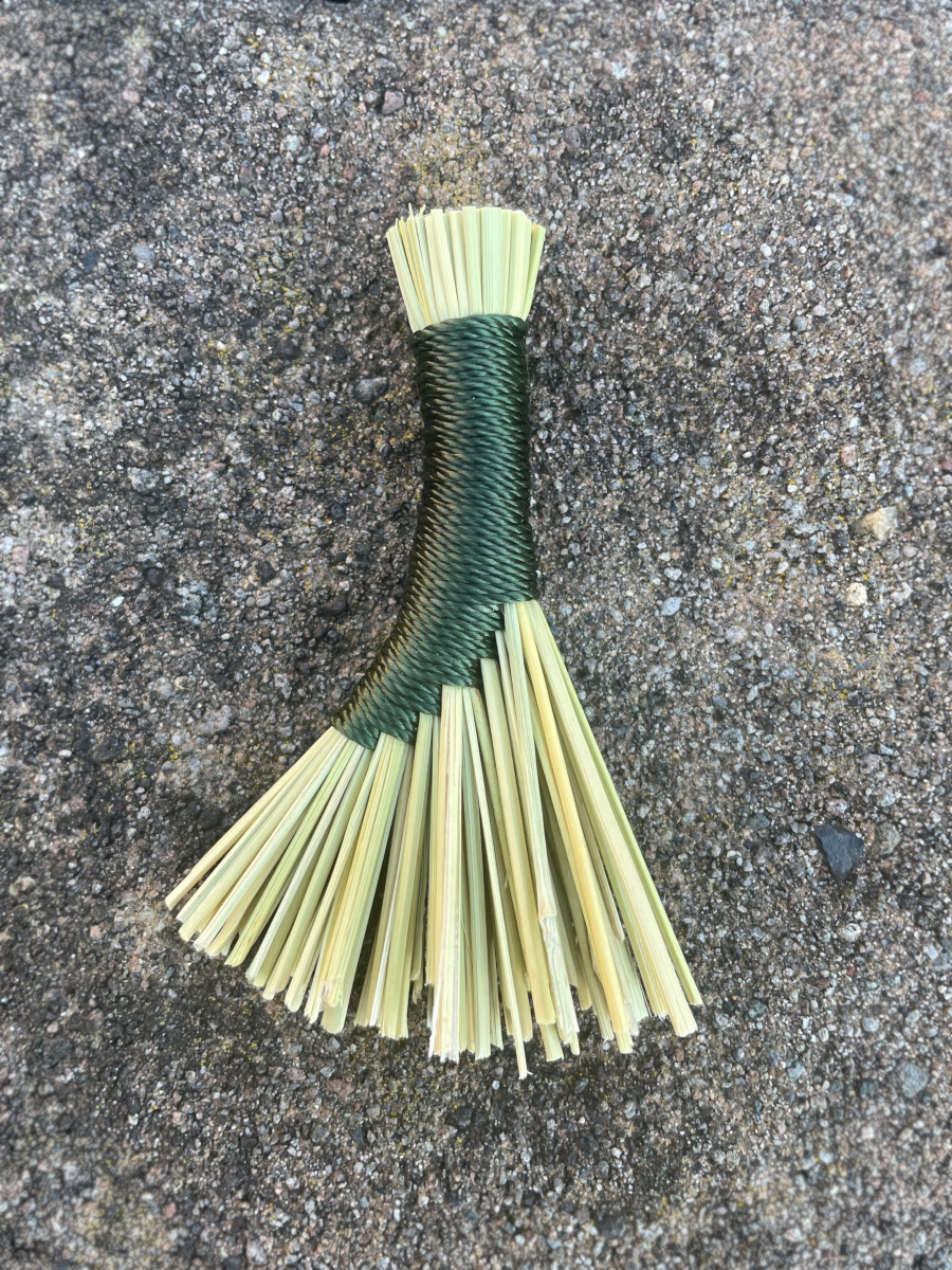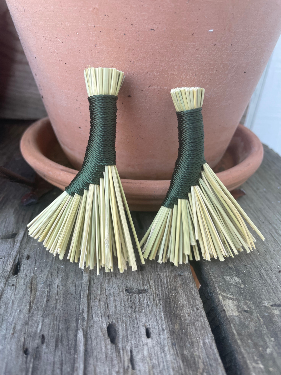 The smallest broom we have available, this handmade tiny Hen Wing style broom, approximately 3″ from top of handle to bottom of sweeping edge! I crafted this whisk broom with natural broomcorn and Forest Green nylon cord. The cord is solidly wrapped up the handle, no breaks. This adorable broom can be used as a mini sweeping broom, an altar broom, or cute decor!