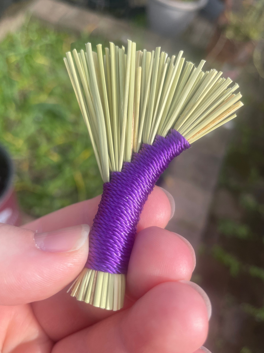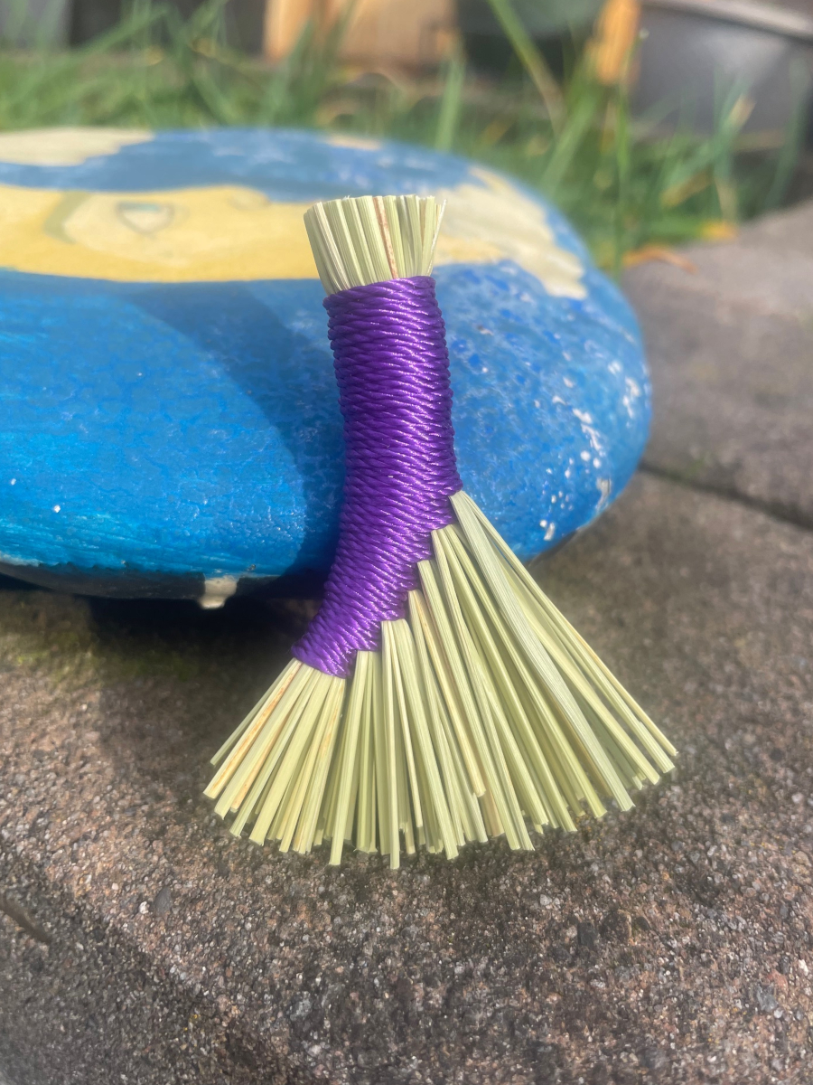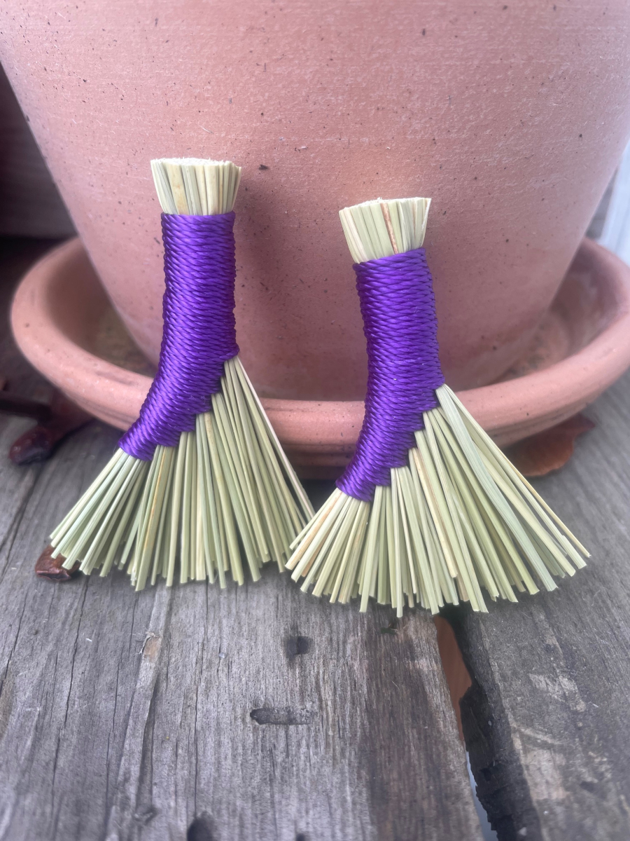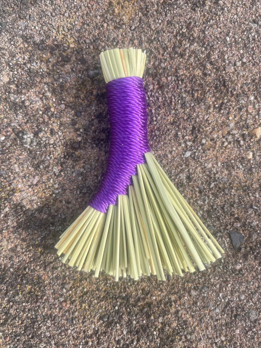 The smallest broom we have available, this handmade tiny Hen Wing style broom, approximately 3″ from top of handle to bottom of sweeping edge! I crafted this whisk broom with natural broomcorn and Purple nylon cord. The cord is solidly wrapped up the handle, no breaks. This adorable broom can be used as a besom, mini sweeping broom, altar broom, or cute decor!