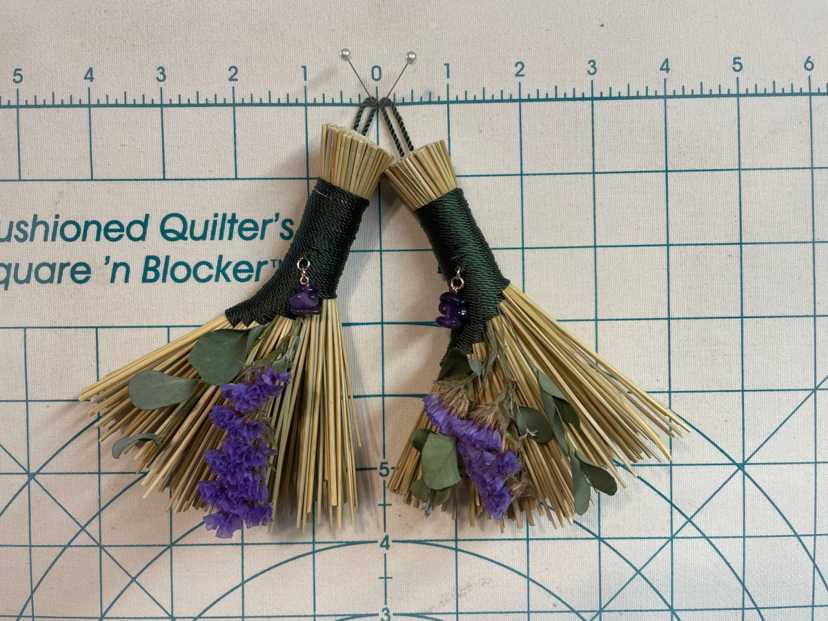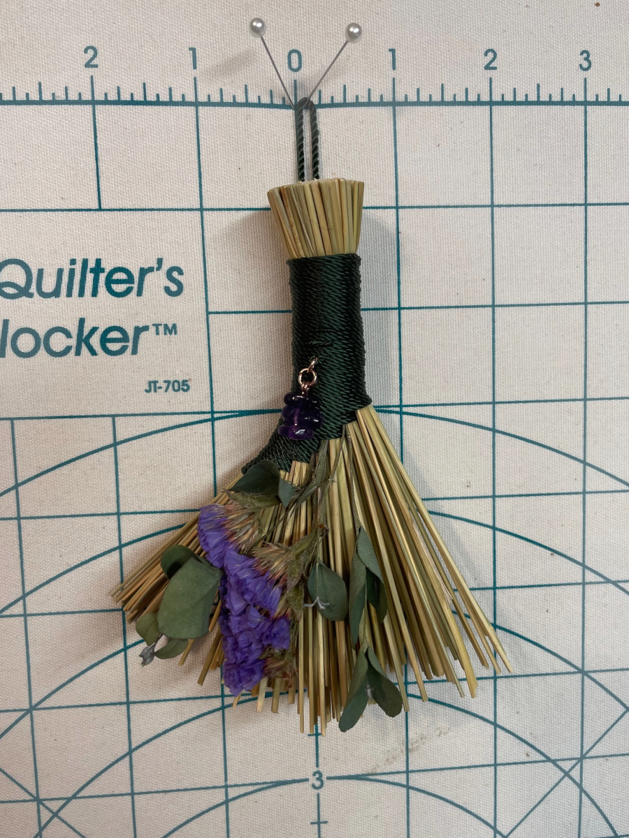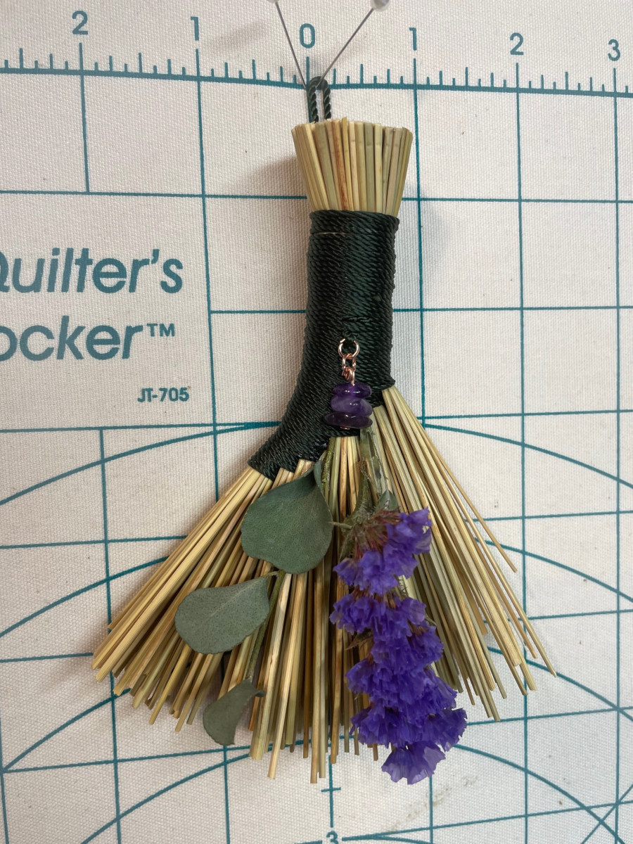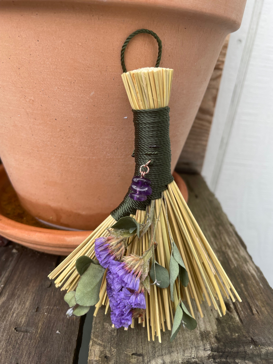 Handmade Tiny Turkey Wing style Brooms, approximately 5” from top of handle to sweeping edge. I crafted these with natural broomcorn and Forest Green nylon cord. The charms are made from copper jewelry wire and Amethyst Crystal Chips. Also has dried Eucalyptus and Statice Flowers laid on top of the broomcorn.
