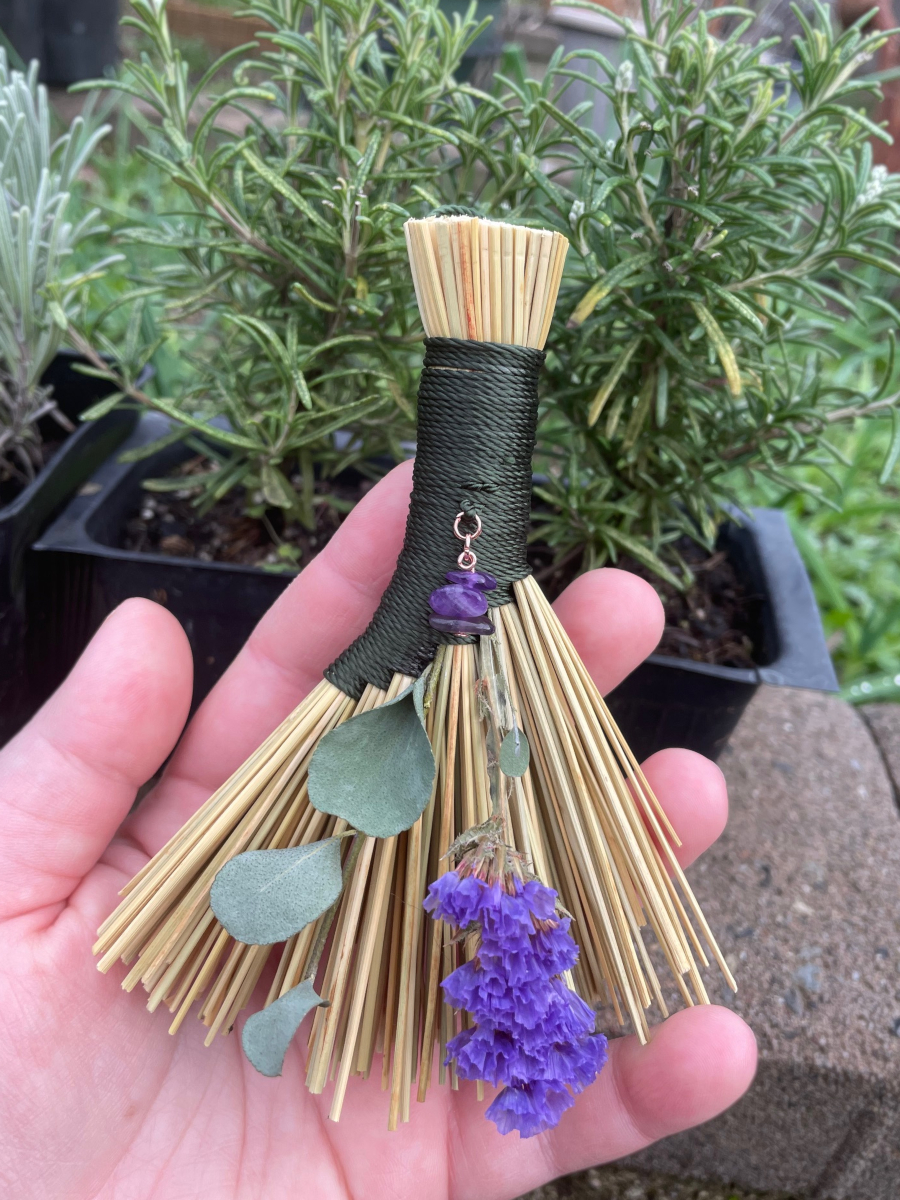 These brooms can be used as ornaments, mini sweeping brooms, altar brooms, or cute decor! Sweep away (very) small debris in your home, or negative energies from your sacred space, with this unique hand crafted broom.