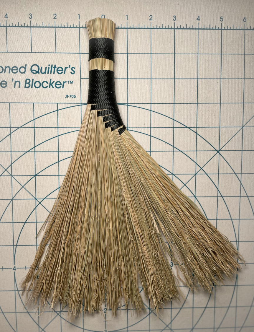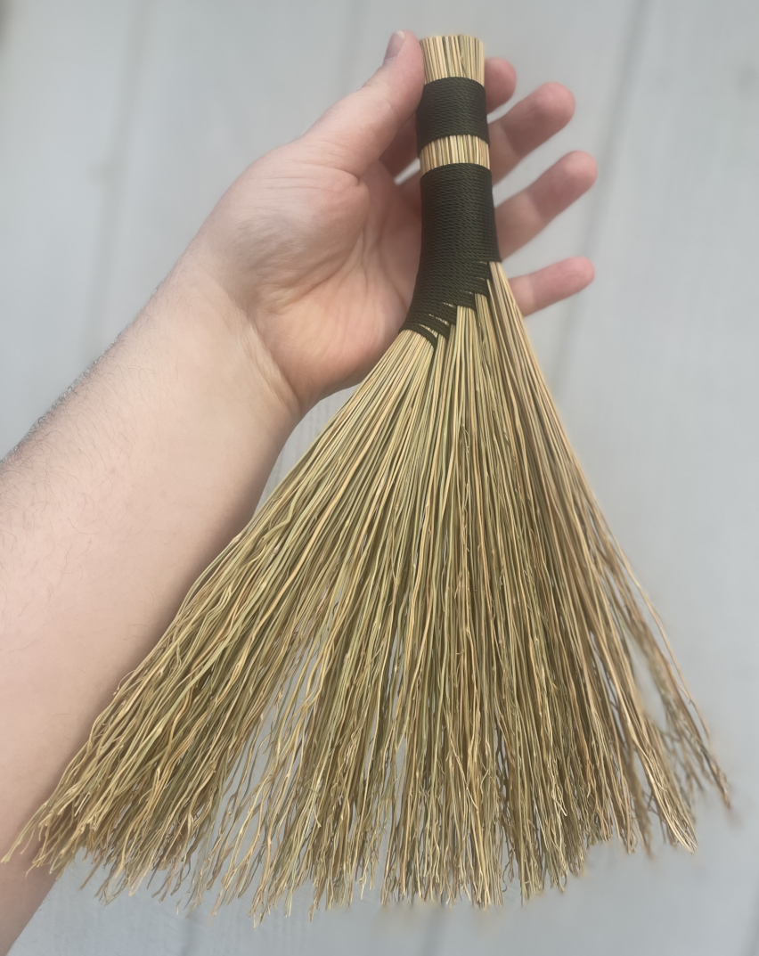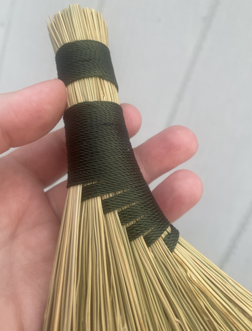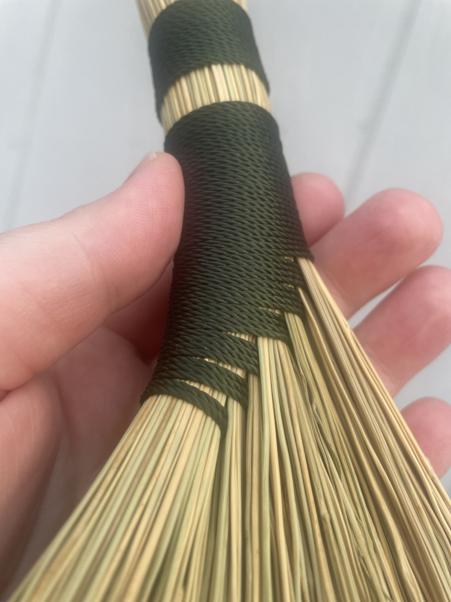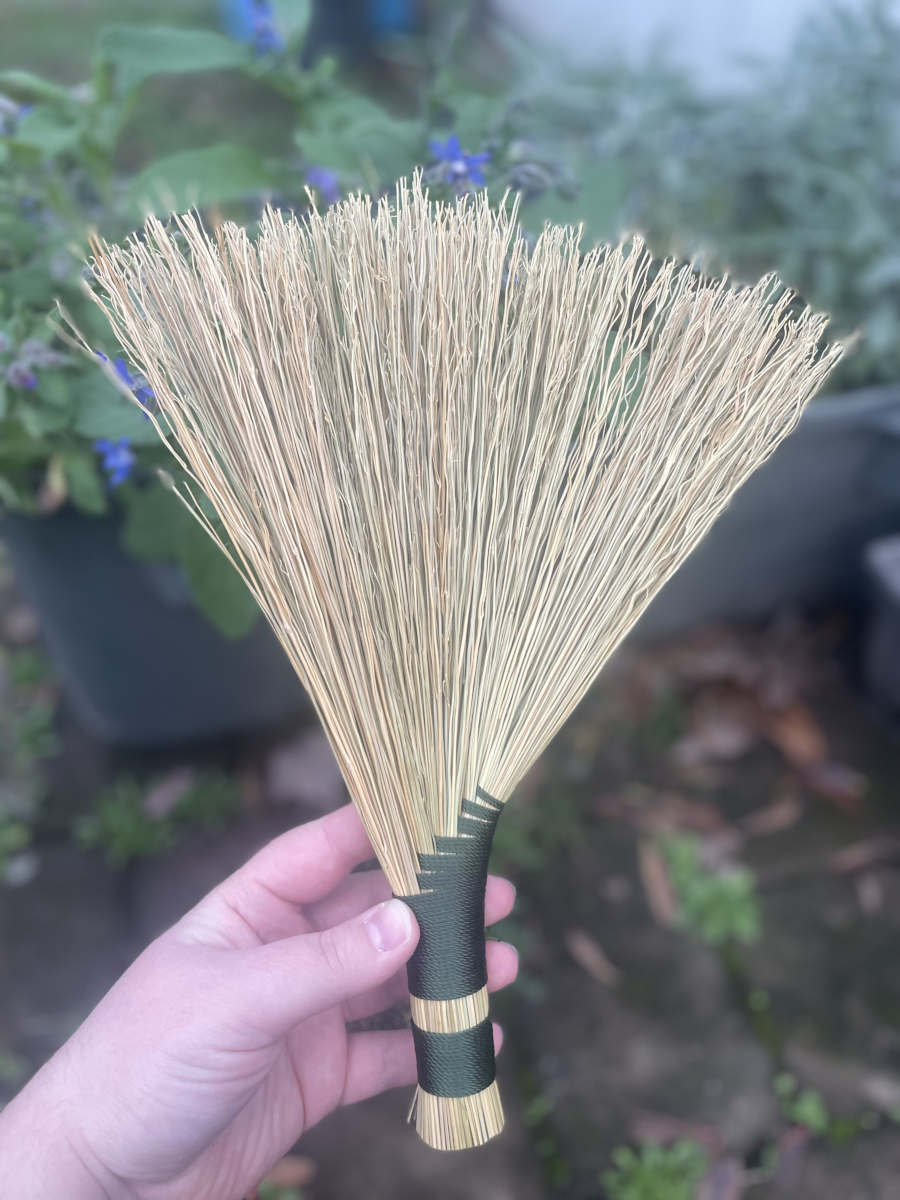 Handmade Turkey Wing style hand broom, approximately 12″ from top of handle to bottom of sweeping edge. I crafted this whisk broom with natural broomcorn and strong nylon cord. This simple broom can be used as a hearth broom, an altar broom, or cute decor! Cord is Forest Green, and broomcorn is its natural undyed color.