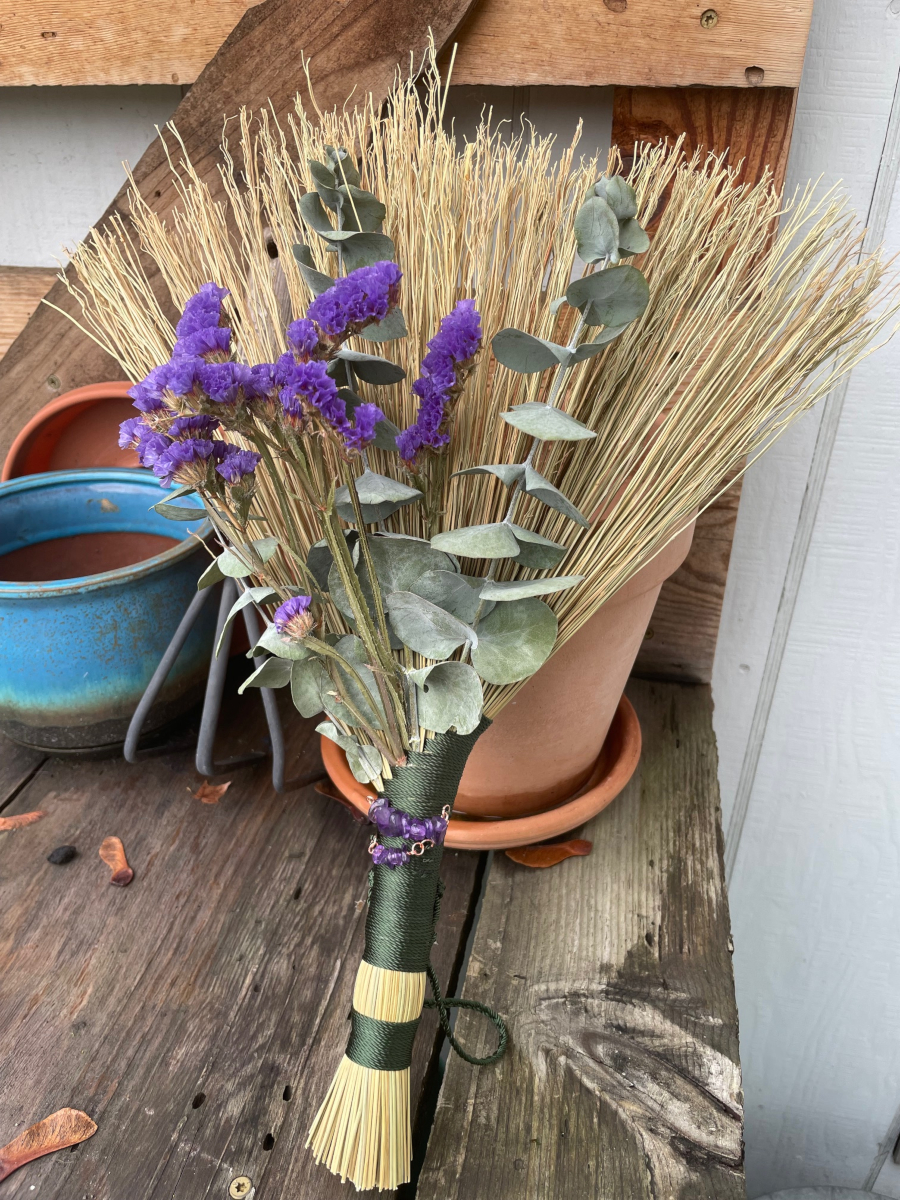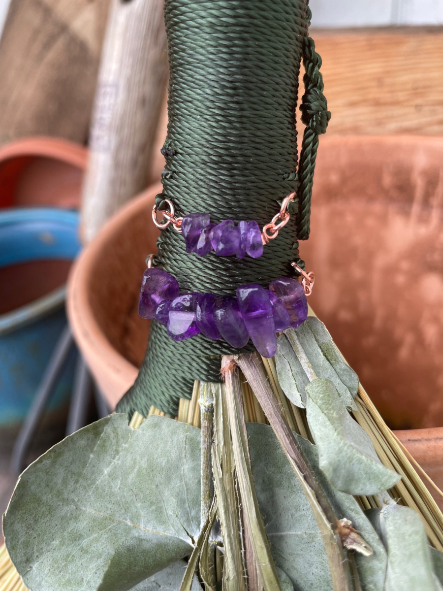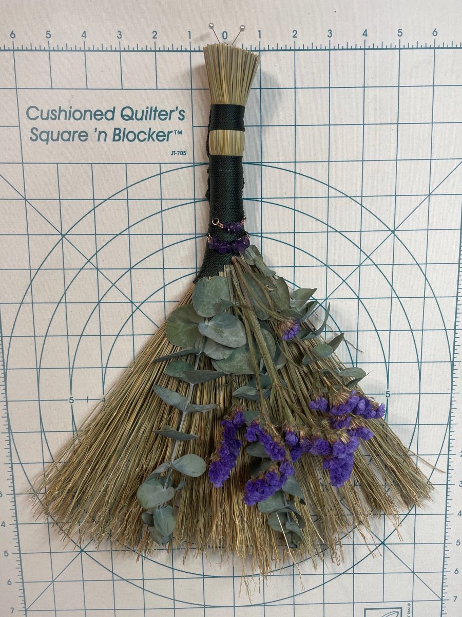 Handmade Turkey Wing style hand broom, approximately 15″ from top of handle to bottom of sweeping edge. I crafted this whisk broom with natural broomcorn and Forest Green colored nylon cord. Has two handmade Amethyst charms in the handle, also dried Eucalyptus and Statice Flowers laid on top of the broomcorn. Has two hanging loops. The main larger loop for hanging the handle side up, or the smaller discreet loop for hanging your broom upside down to nudge out unwanted guests (or hang the broom however you like).