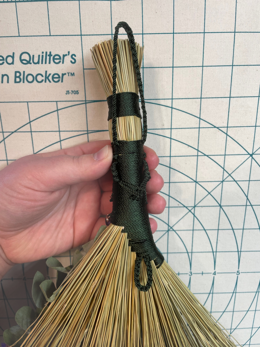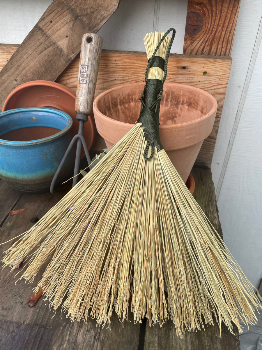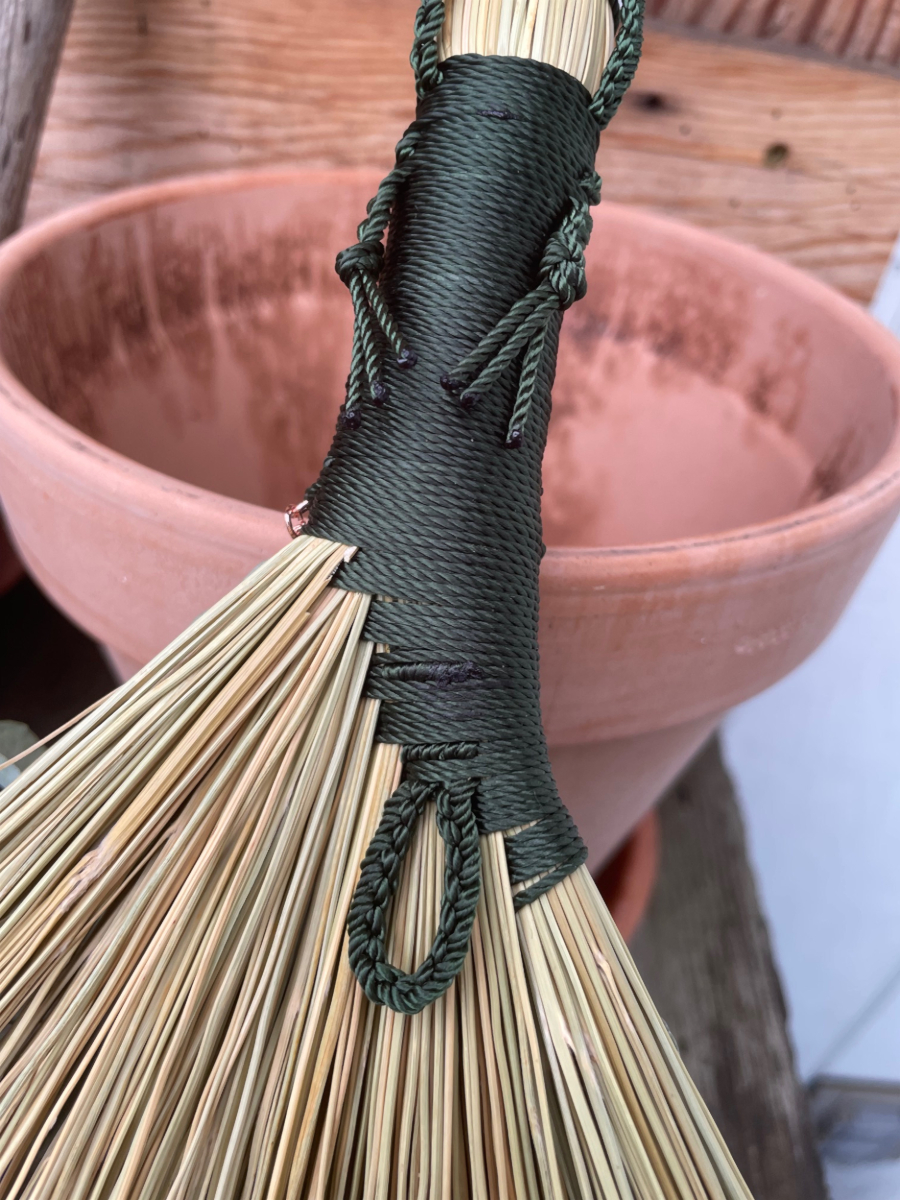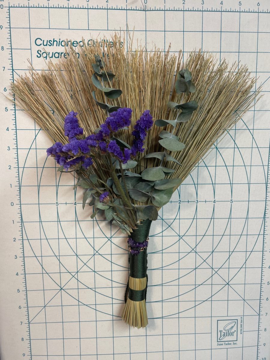Handmade Turkey Wing style hand broom, approximately 15″ from top of handle to bottom of sweeping edge. Forest Green cord handle with natural broomcorn body. Has Amethyst, dried Eucalyptus and Statice Flower details.