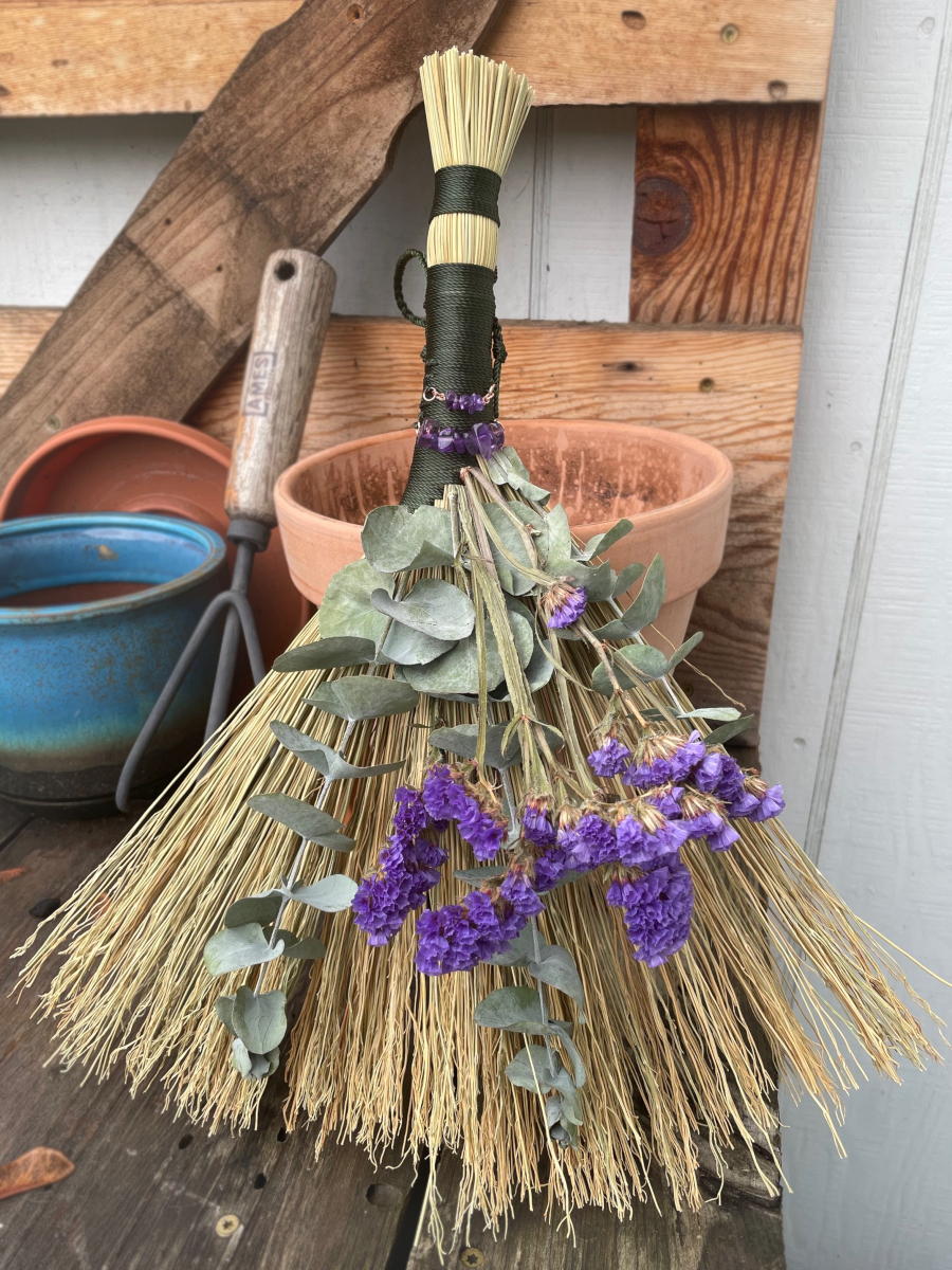 If you are interested in a custom made broom, please let me know! I have a lovely stash of decorative dried flowers, beads, crystal chips, and trinkets to add to my handmade brooms. Send me a message, I will price out a quote, and let me create something uniquely beautiful for you!